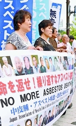 原告の女性(73)は石綿工場で10年以上働いていました。「当時、危険性を知らされず、ガーゼマスクをしただけでした。3人の子に恵まれ、ずっと健康だと思っていたのにレントゲン検査をしたら、肺に細かい針のようなものが刺さり、真っ白でした。いまは肺が縮み、胸に石を載せられているような感じで苦しい」と語りました。