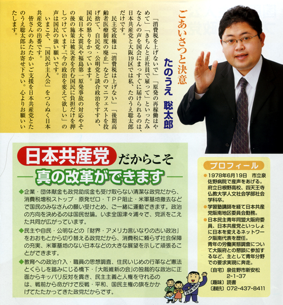 日本共産党阪南地区委員会のホームページです。大阪府の泉州地域の南部、高石市・和泉市・泉大津市・岸和田市・貝塚市・泉佐野市・泉南市・阪南市・忠岡町・熊取町・田尻町・岬町(8市4町)を担当し、地域での日本共産党の活動や情報を紹介しています。
